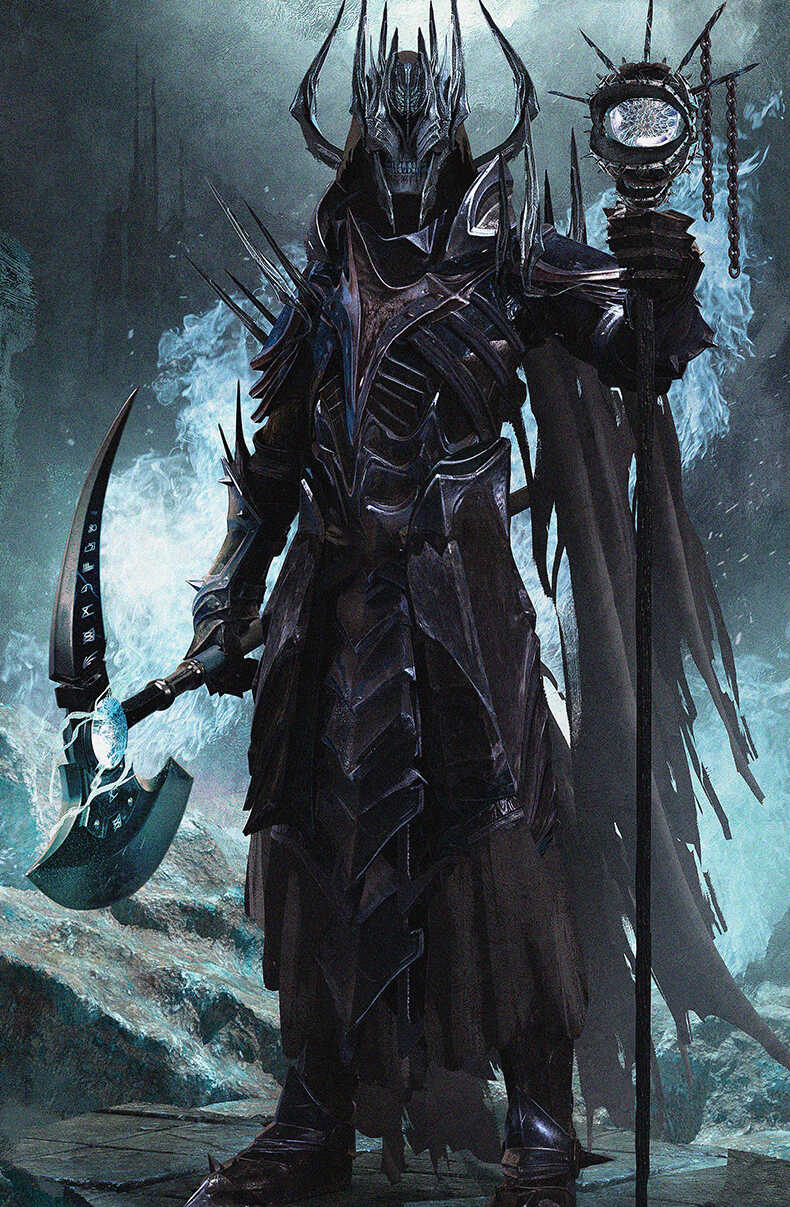 Для женского облика лич все же приветствует красоту. Просто потому что нравится красота в противоположном поле. Бархатный белый наряд остается основным характерным, но добавляются бирюзовые сатиновые подкладки (вот эта ваша нефункциональная внутренняя отделка мантии), а металл украшает позолота. Мечам в женском облике дарх предпочитает скорее облик изящного посоха с крупным камнем.