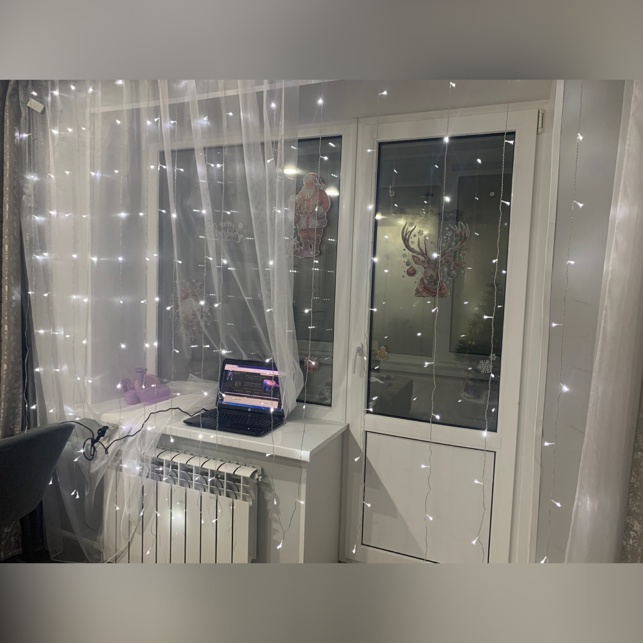 Я очень звиняюсь за задержку!! Но эта кутерьма унесла меня в реальность с головой)) Вот. Мои старания. Окна, шторы с огоньками, стёкла на шкафах, ноут с форумом и сама королева этого балла – ёлка)))