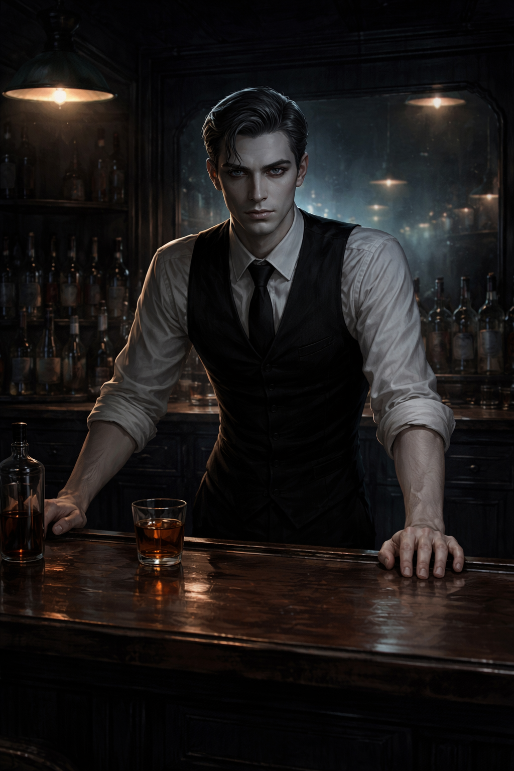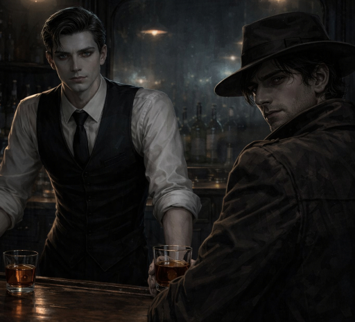 Мужчина в тёмном пальто устало снял с себя мокрую шляпу и медленно подошел к краю стойки. Лицо — аккуратное, правильное, бледное и чуть усталое, но правильное для «серых» операций. Даже слишком. Не запоминающееся. Он повернул голову медленно, без лишней пластики.