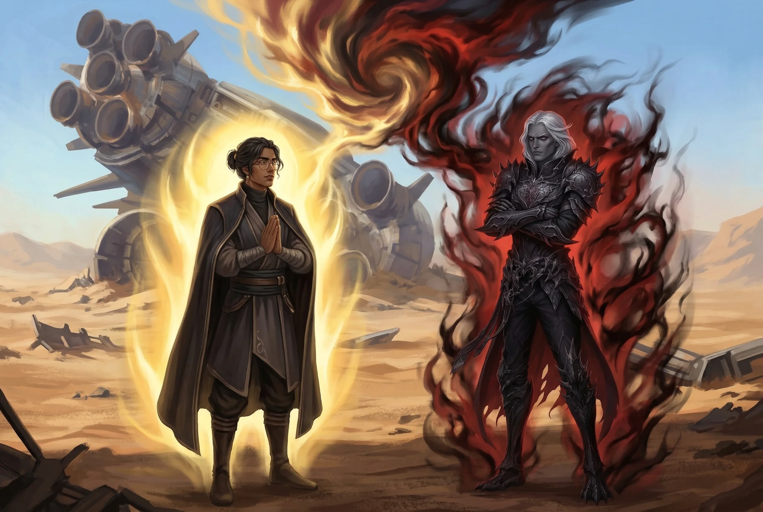 Взгляд голубых глаз хтоника вцепился в молодого мужчину. Вдох. Уверенный шаг вперёд. Дракон нёс себя гордо, несмотря на то, что по песку было крайне неудобно идти. Казалось, местность пыталась его удержать, или хотябы притормозить. Кай упрямо подопустил голову, от чего его взгляд теперь стал исподлобья. Выдох. Ещё шаг и ещё. Хтоник уверенно подходил ближе. В его руках не было оружия, хотя тех, кто его знал, это бы не особо успокоило - Дракон дрался когтями, хвостом, лапами, магией. Он молчал до тех пор, пока не подошёл на достаточное расстояние, чтобы не приходилось орать и можно было бы услышать его весьма спокойный и красивый голос.